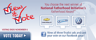 Voting for the 2011 Fatherhood Award™ ends this Sunday, November 6th. To cast your vote, click here.